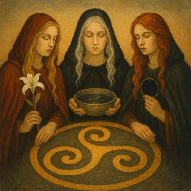 Oft erscheint sie in ihrer dreigestaltigen Natur – als die drei Schicksalsgöttinnen, die wir in vielen europäischen Mythen wiederfinden:Im alten Griechenland kennt man sie als die Moiren: Klotho, Lachesis und Atropos. In der nordischen Mythologie begegnen sie uns als Nornen: Urd, Verdandi und Skuld.